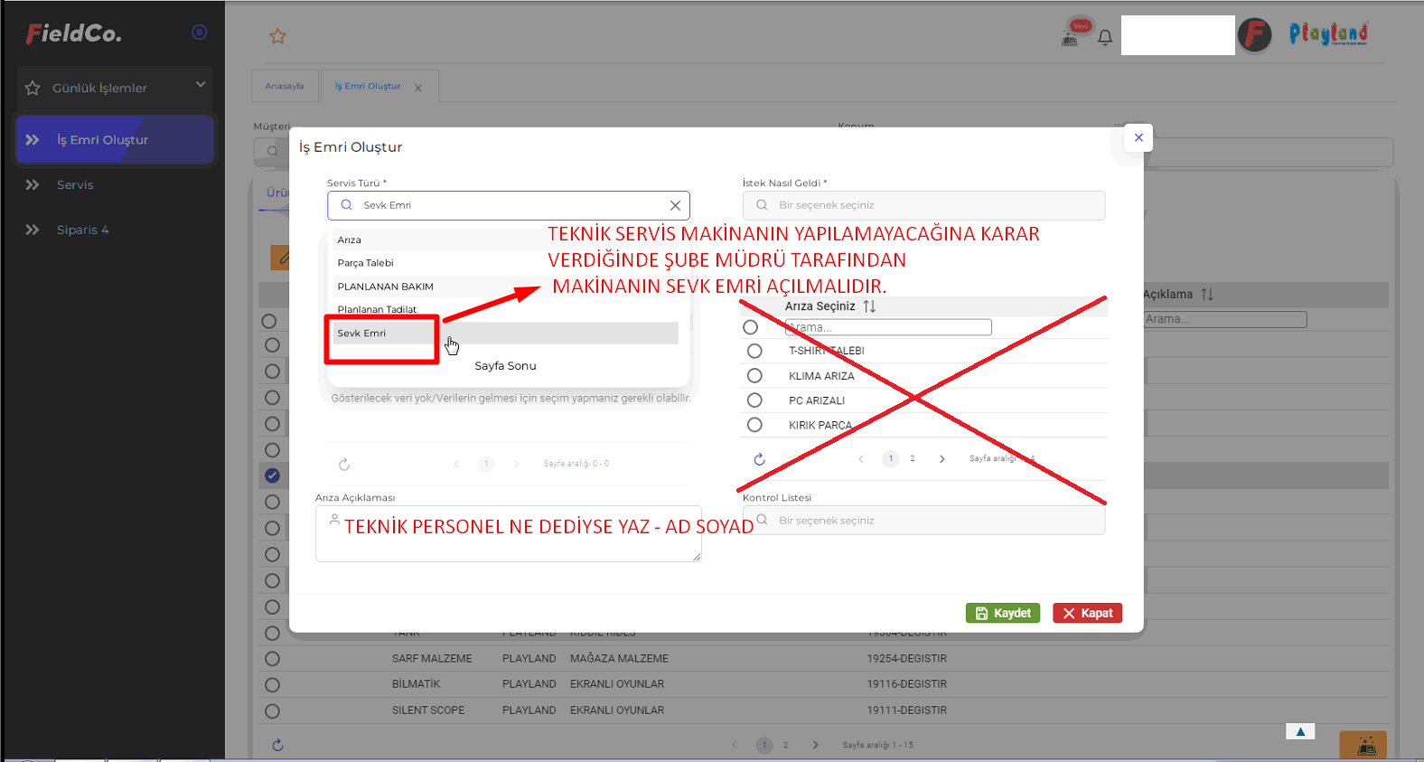 KARŞIMIZA ÇIKAN SAYFANIN ALT KISMINDA OYUNCAK LİSTELERİ MEVCUT, SEVK EMRİ AÇILACAK OLAN OYUNCAĞISEÇ VE HEMEN ÜSTÜNDE İŞ EMRİ OLUŞTUR YAZISINA TIKLA.